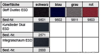 Für die Sitzfläche stehen Stoff Duotec ESD oder Kunstleder Skai ESD zur Auswahl.