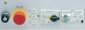 Absicherung 10 - 16A, mit thermischer und magnetischer Unterspannungsauslösung, drei Phasenkontrollleuchten.