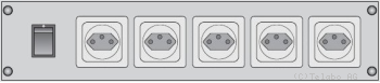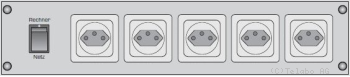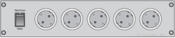 | Netzschalter für Rechner, direkt ans Netz angeschlossen, mit fünf Schutzkontakt Steckdosen T13. |