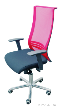 Sitz dick gepolstert in schwarz, Netzrücken in rot oder blau, Rücken inkl. verstellbarer Kunststoff-Lordosestütze.